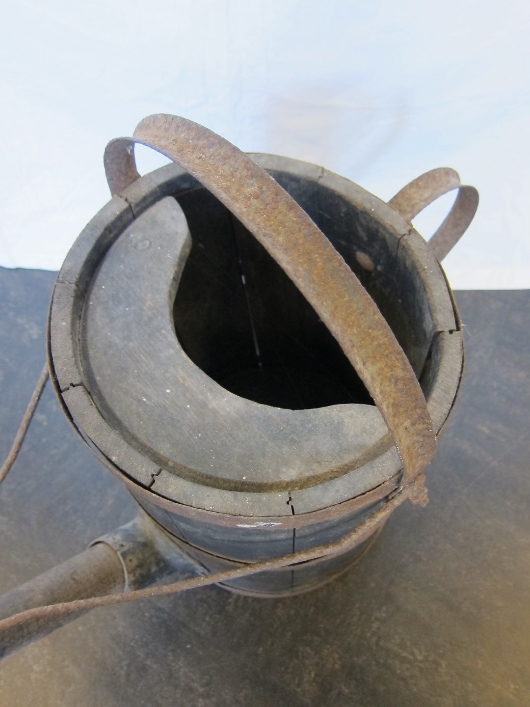 Old watering can made of wood and iron with a long spout