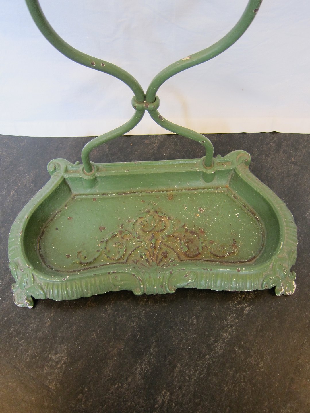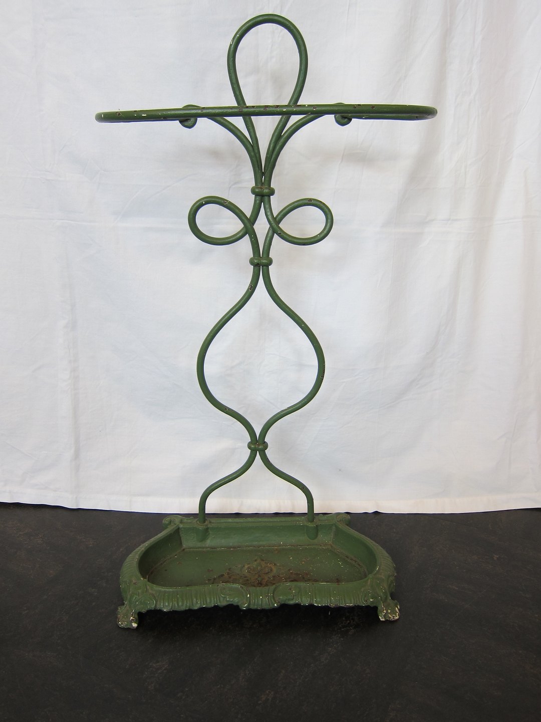 Beautiful old umbrella stand made of green painted iron with a beautiful shape and decorations