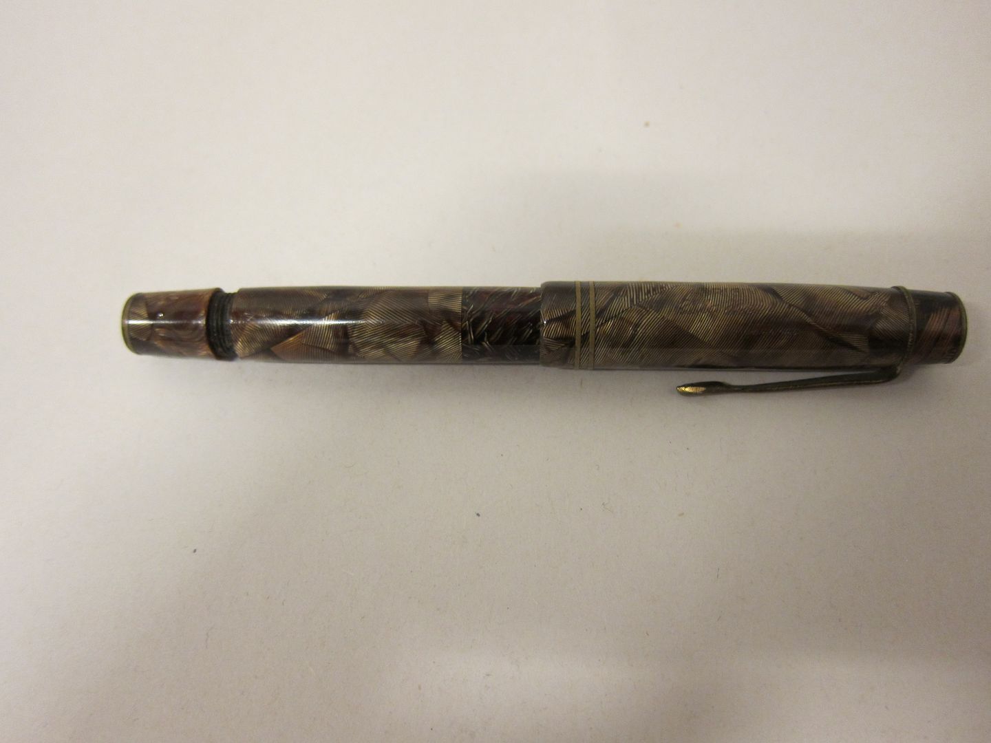 Fountain pen Brown marbled, Original Big Ben British Patent: 451-168 14 karat gold, Stamp: 14k585 We have more fountain pens Please contact us for further information Articleno.: 1006