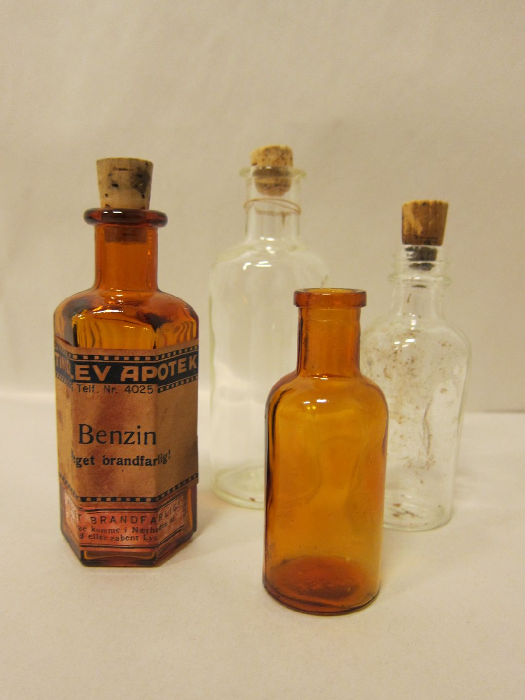 Front left: Braun with etiquette "Benzin Meget brandfarlig" (very flameable), from Tinglev Apotek (pharmacy), Denmark, with stopper, H: 10,5cm, Dkr.: 150,- SOLD