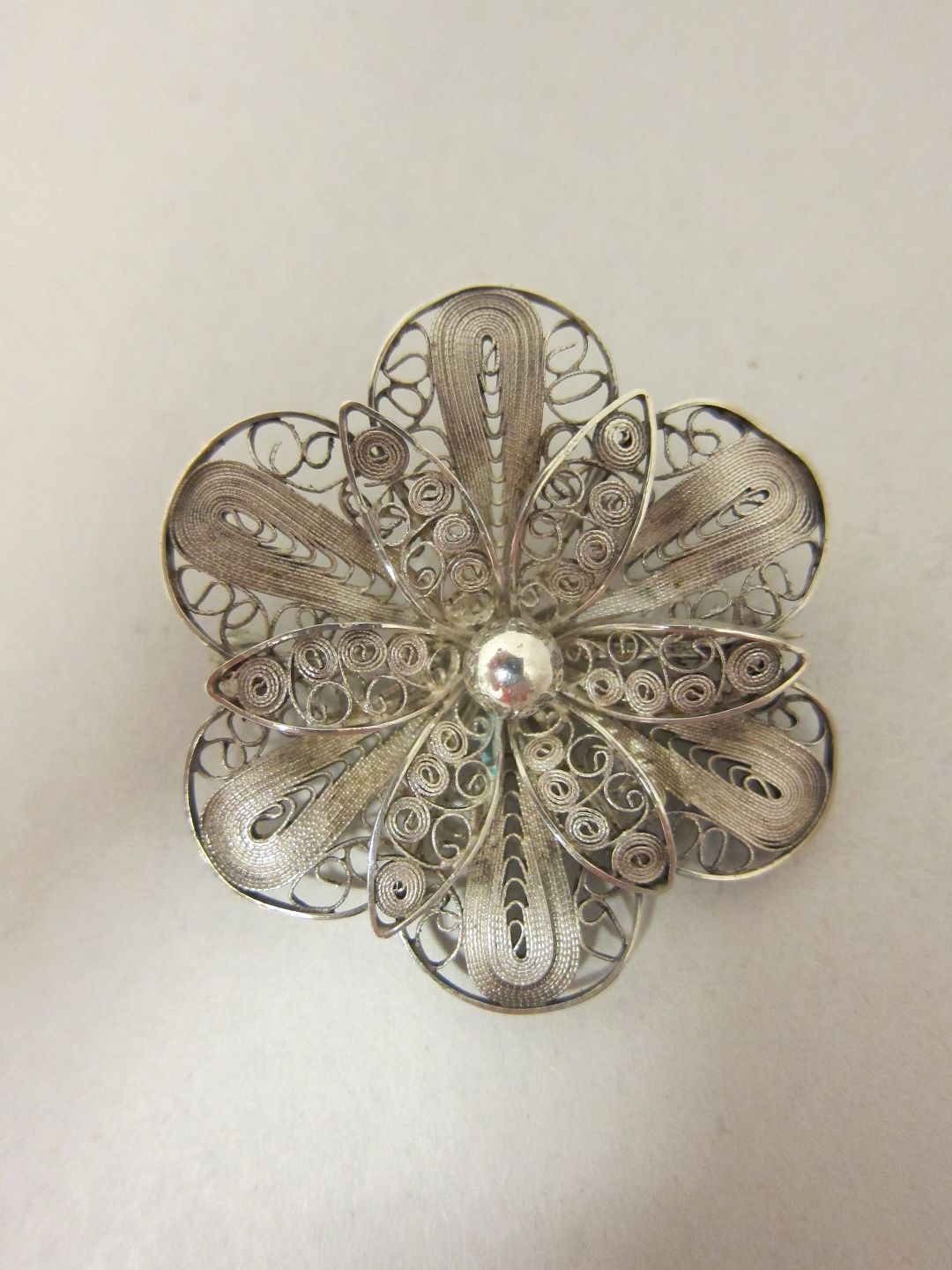 Brooch made of silver, filigree work Stamp: 925s Diam: 4cm PLEASE NOTE: NO SILVER IN THE SHOWROOM - please contact us presentation Articleno.: 51911