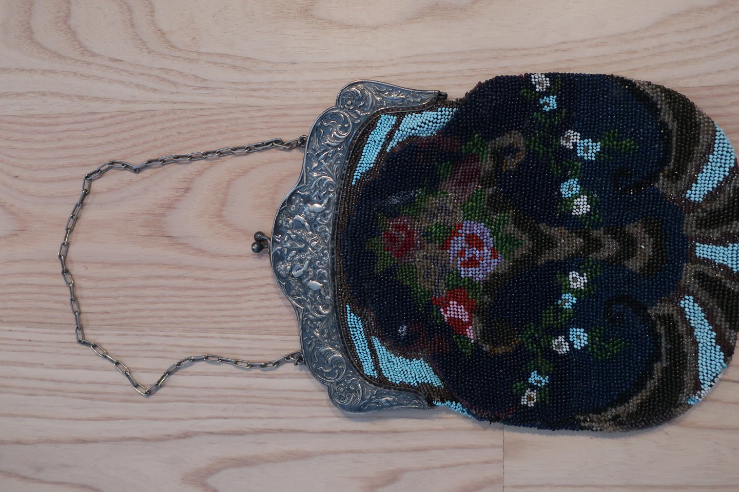 This beautiful old handmade bag, from about 1880, is handmade of glass beads with embroidery which shows creative figures