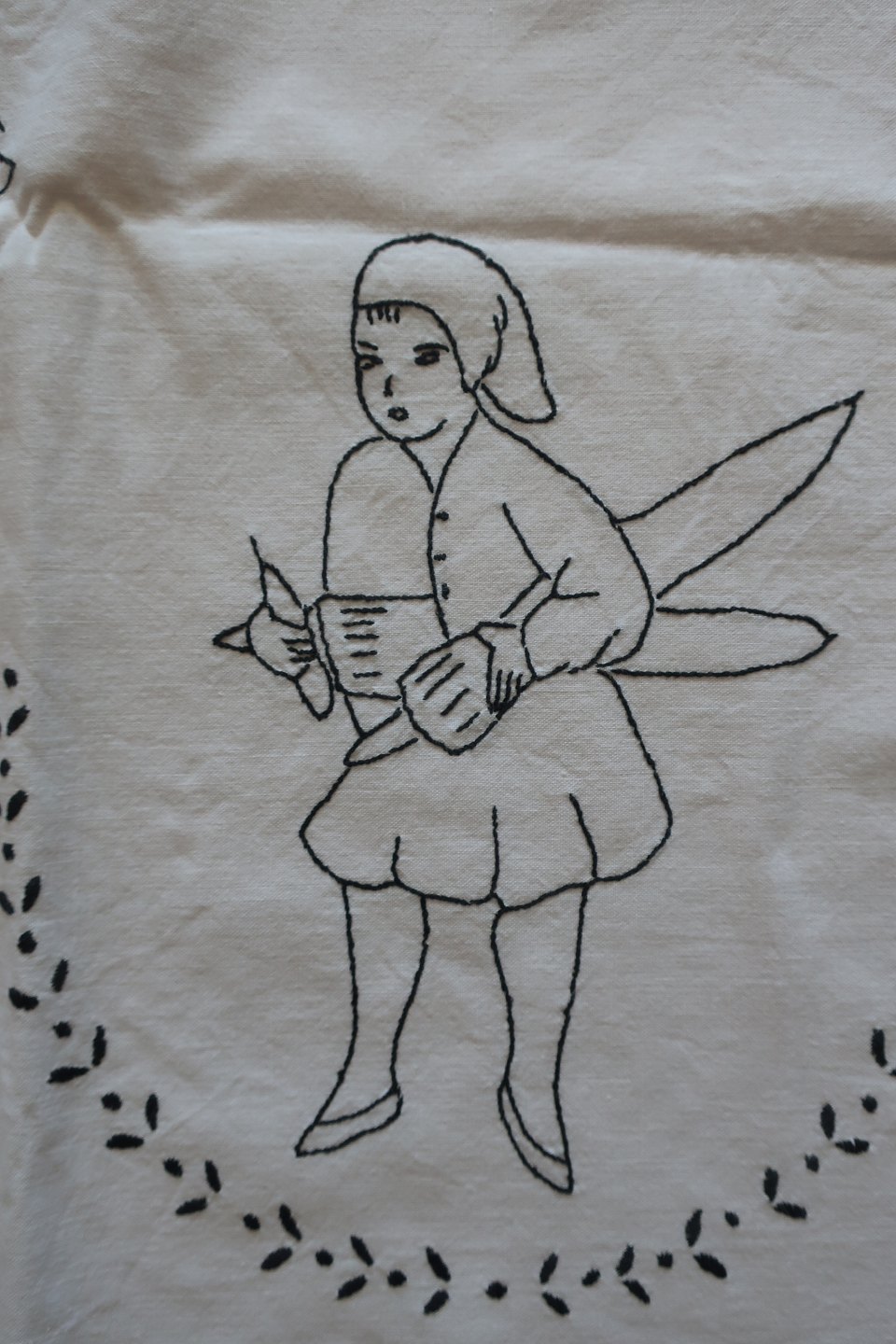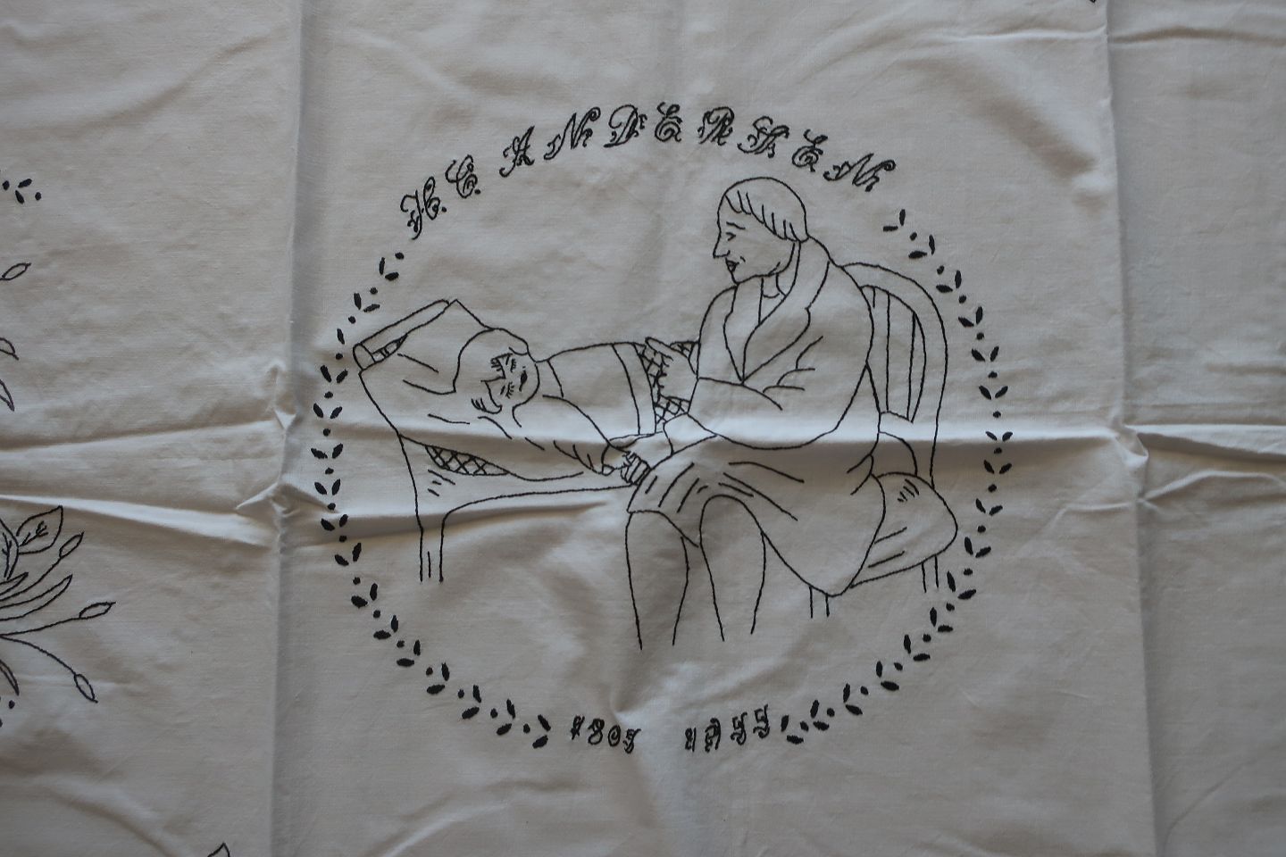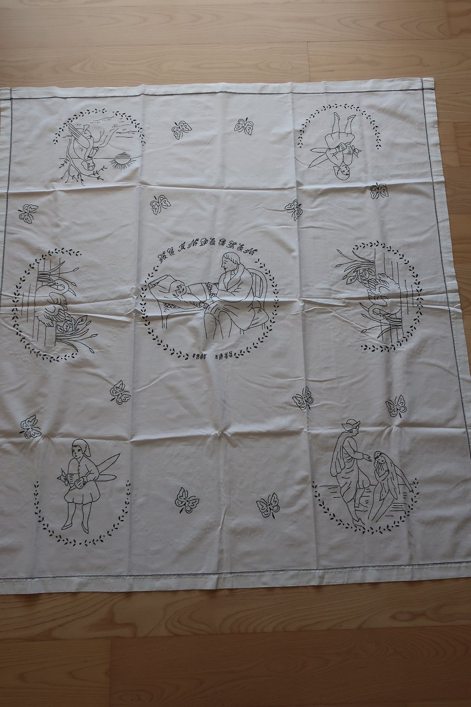 Old table cloth With embroidery in colours - made by hand H. C. Andersen Illustrations About 127cm x 114cm In a good condition Articleno.: DG106-4-51131