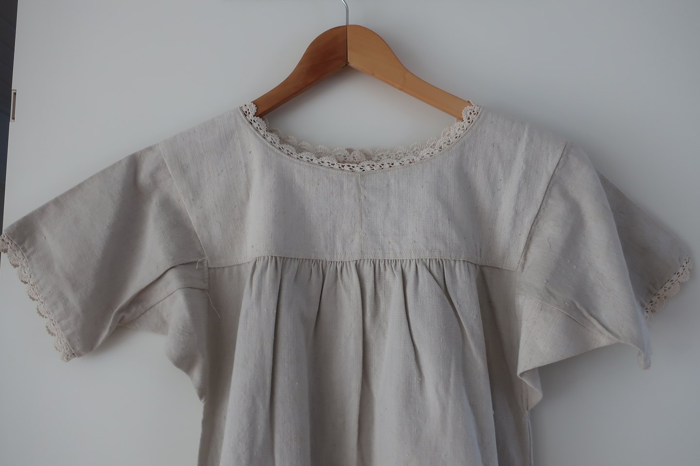 An antique shift with hand made buttonholes, embroidered hand-made initials and other items to make the dress beautiful